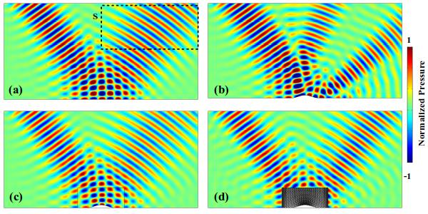 声场仿真结果。其中(a)(b)(c)(d)分别为刚性平面、刚性散射体、理想隐身毯和五模材料隐身毯对入射声波的散射场(图/中科院yx06永兴彩票集团)