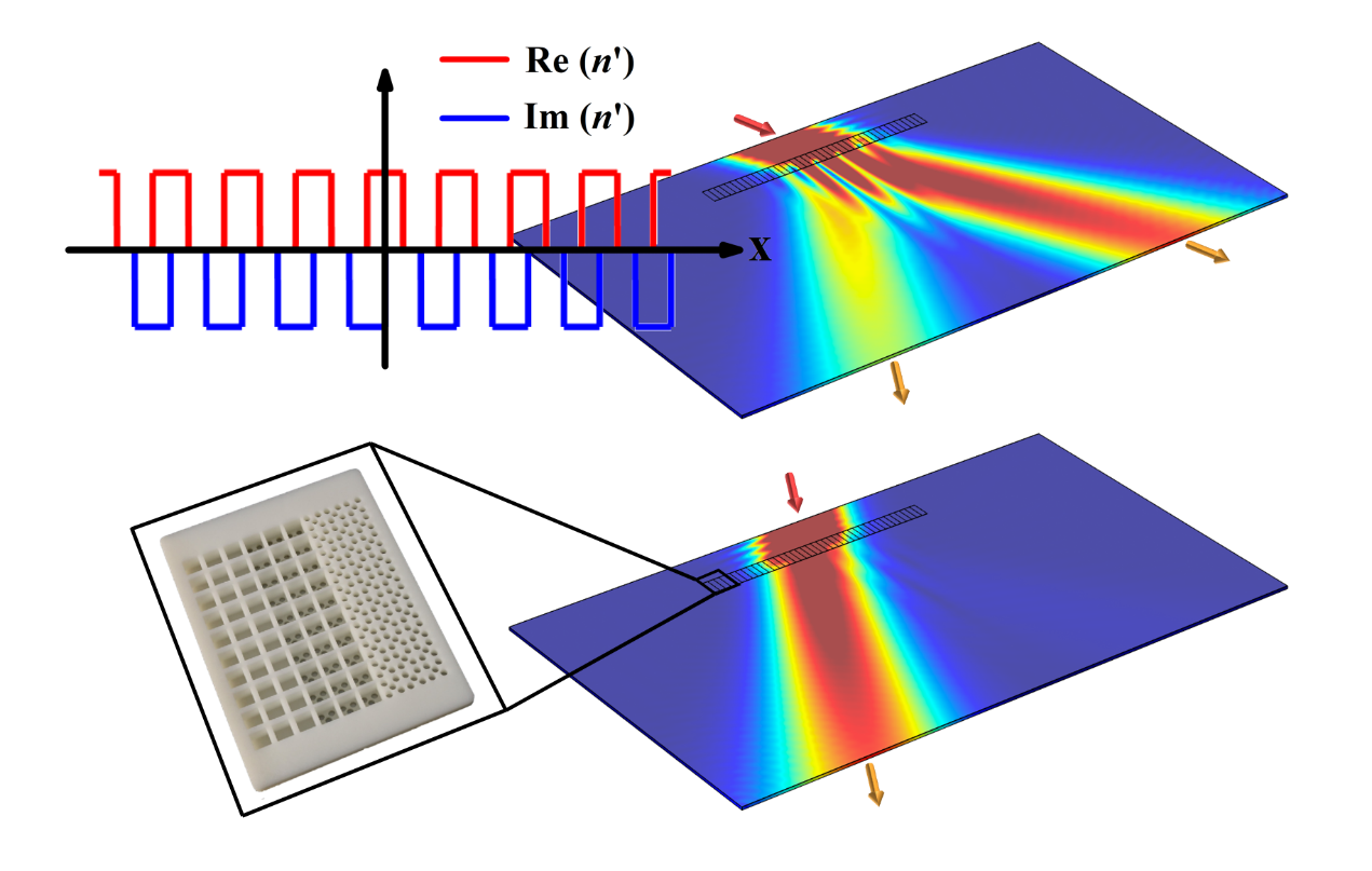 该课题组在波导板上增加侧腔结构来增大等效折射率的实部,在波导板上开设漏声小孔并铺设吸声棉引入声能损耗。两种结构对折射率实部和虚部的调节是相互独立的,研究人员将两种结构巧妙地组合在一起,实现了对折射率实部和虚部的共同调节。