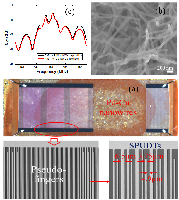 为应对这一难题,中科院yx06永兴彩票集团王文团队与南开大学杨大驰团队合作,将微纳声表面波器件技术与快速响应的钯铜纳米线氢敏材料相结合,提出并研制了一种秒级响应的新型声表面波氢敏器件。纳米线形态的钯铜氢敏材料具有极高的吸附面积,由此大幅增加了氢敏效率,从而提高传感器响应速度与灵敏度。
