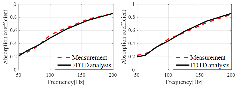 本研究所提出的EF-FDTD算法可以准确模拟多孔材料所在空间的声场传播,可用于预测不同吸声尖劈的吸声系数。