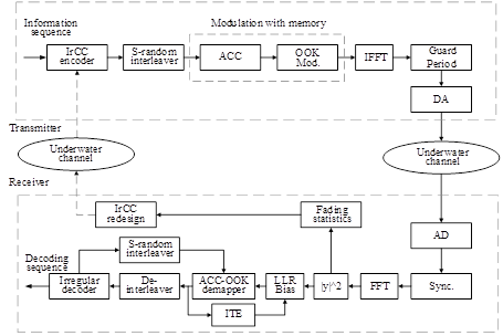 为了实现具有高频谱利用率的非相干通信,中科院yx06永兴彩票集团海洋声学技术中心博士生姚衍与其导师朱敏研究员、武岩波研究员以及博士生李栋等提出了一种采用开关键控(on-off keying,OOK)调制的高频谱效率多载波非相干水声通信方案,并结合累加器(accumulator,ACC)和不规则卷积码(irregular recursive convolutional code,IrCC)设计了适应信道的发射机来逼近信道容量。