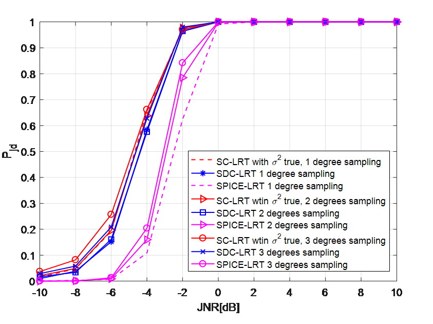 为解决上述问题,中科院水下航行器信息技术重点实验室郝程鹏团队与意大利、美国和国内同行四方开展针对性的合作研究,提出基于迭代最小化稀疏学习(sparse learning via iterative minimization, SLIM)的两种NLJs检测方法,分别为稀疏循环似然比检测(sparse cyclic likelihood ratio test, SC-LRT)和稀疏双循环似然比检测(sparse doubly cyclic likelihood ratio test, SDC-LRT),新方法可实现对多个NLJs的检测,同时能准确估计其数量和波达角度,有效对抗来自天线旁瓣的NLJs攻击。