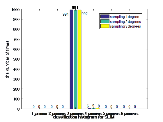 研究结果显示,研究人员提出的SC-LRT和SDC-LRT比现有基于协方差矩阵估计的稀疏迭代似然比检测(sparse iterative covariance-based estimation likelihood ratio test, SPICE-LRT)具有更高的检测概率(图1)和更低的参数均方根 (root mean squared, RMS) 估计误差(图2)。此外,在1000次独立仿真试验中,SLIM方法在3种采样间隔下的NLJs数量估计准确度均达到了99%,而SPICE方法在2度和3度的网格采样率时估计准确度为93%以上(图3~图4)。