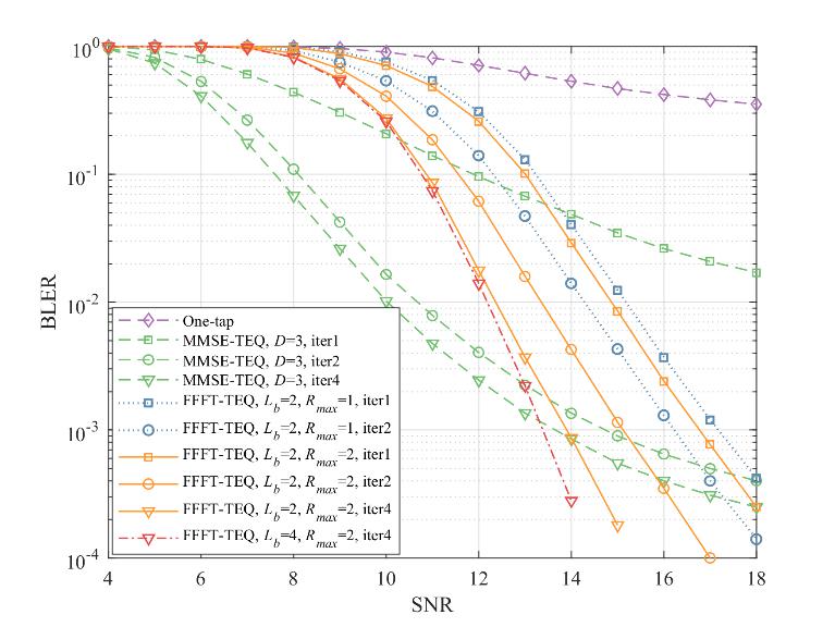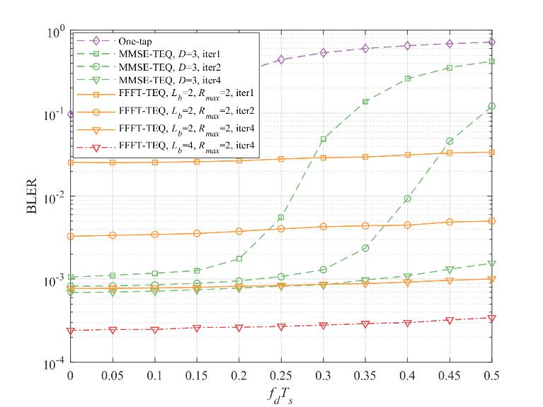 研究人员将提出的分数间隔快速傅里叶变换turbo均衡(Fractional Fast Fourier Transform-Turbo Equalization, FFFT-TEQ)与相干OFDM系统中基于MMSE(Minimum Mean-Squared Error)估计的turbo均衡器(MMSE-TEQ)的误块率(block error rate, BLER)性能进行对比,仿真结果显示,使用新型均衡器的差分系统在高信噪比下能获得的误块率性能优于相干系统(图2),并且其性能对多普勒频率的变化更为稳健(图3)。另外,它的计算复杂度较相干系统降低了约两个数量级。
