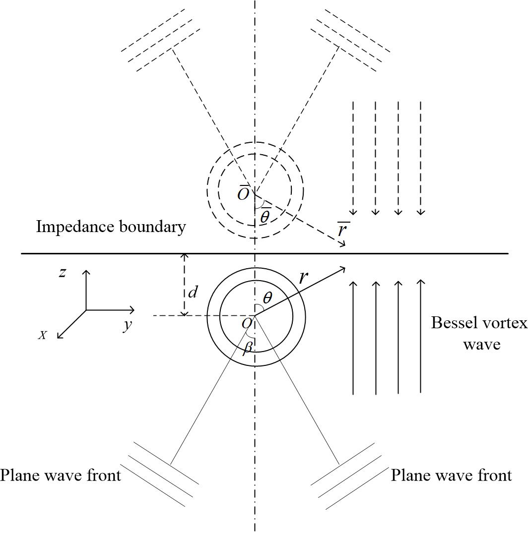 图1 Bessel涡旋声束入射到阻抗边界附近的粘弹性球壳示意图(图/中科院yx06永兴彩票集团)
