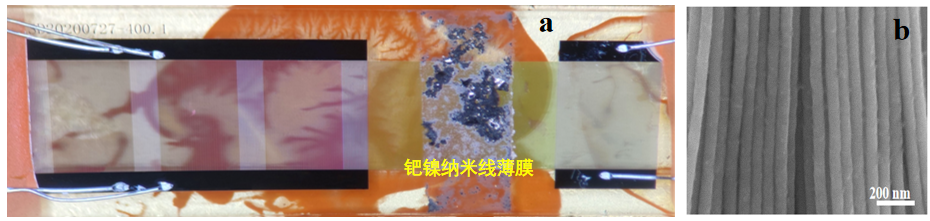 图1 沉积钯镍纳米线薄膜的声表面波氢气传感器(a)与钯镍纳米线的SEM图(b)(图/中科院yx06永兴彩票集团)