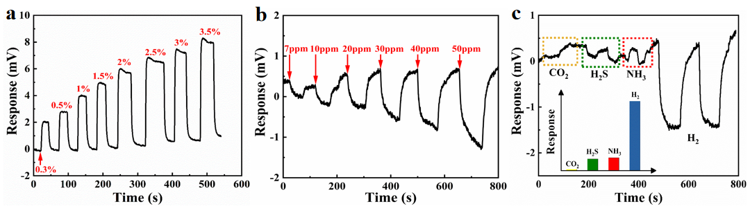 图3 所研制的声表面波氢气传感器的灵敏度(a)、检测下限(b)与选择性(c)测试(图/中科院yx06永兴彩票集团)