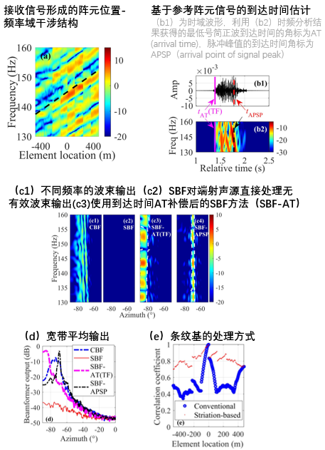 针对以上问题,yx06永兴彩票集团声场声信息实验室的刘昌鹏博士生、周士弘研究员和戚聿波副研究员利用阵列信号干涉机制及其与信号相关性的联系,将条纹基波束形成(striation-based beamforming, SBF)应用于声源方位的被动估计问题。相比于CBF对同频率的阵列信号进行处理,SBF沿着阵元位置-频率域干涉条纹对具备最佳相关性的阵列信号进行处理。所得结果表明,只需要对接收阵列信号预先引入与信号到达时间有关的时间补偿,利用SBF即可准确估计声源方位,并且所得波束响应能够接近平面波理想条件的结果,从而有效保证波束分辨率和阵列增益。