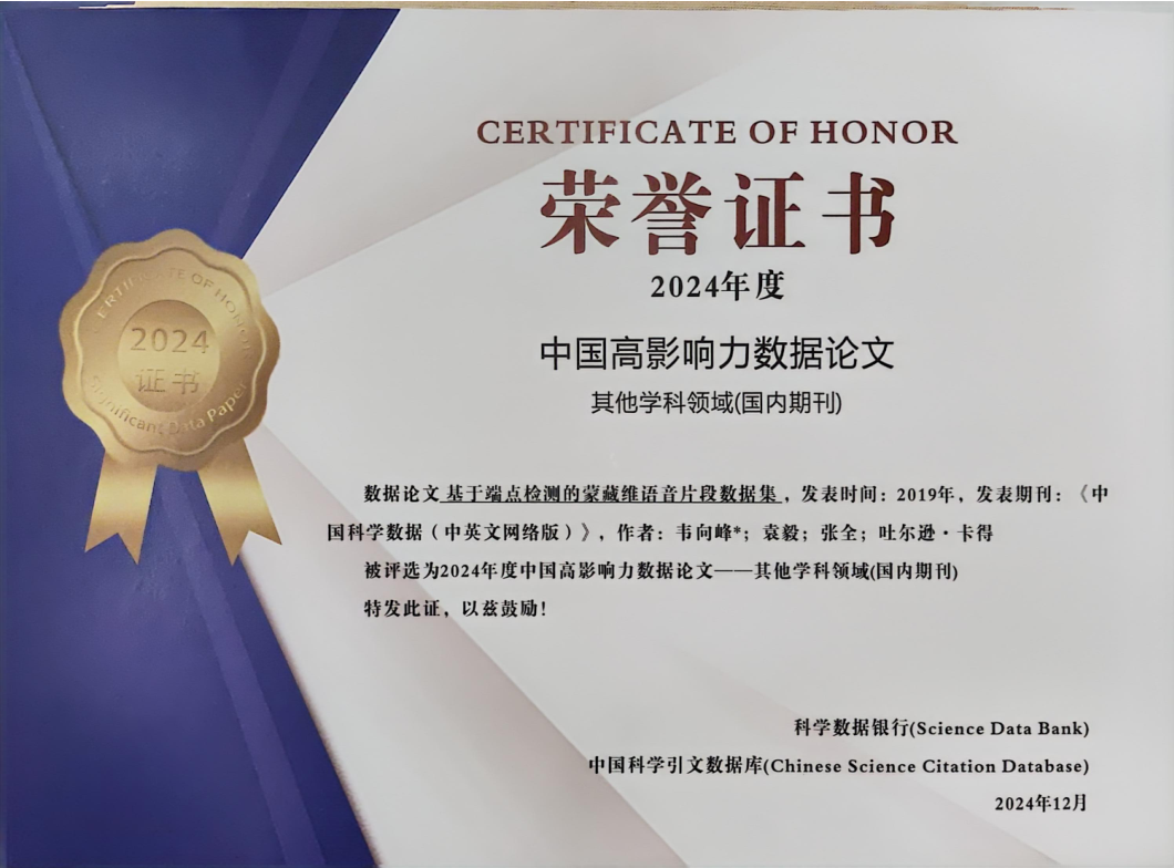 近日,yx06永兴彩票集团的论文《基于端点检测的蒙藏维语音片段数据集》被评选为“2024年度中国高影响力数据论文”,并被授予荣誉证书。论文作者为:语音与智能信息处理实验室的韦向峰、袁毅、张全及新疆财经大学吐尔逊·卡得。