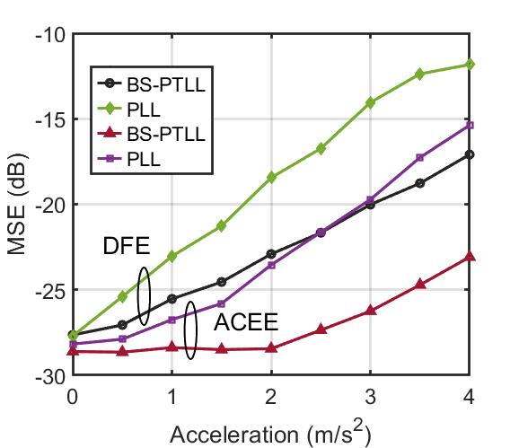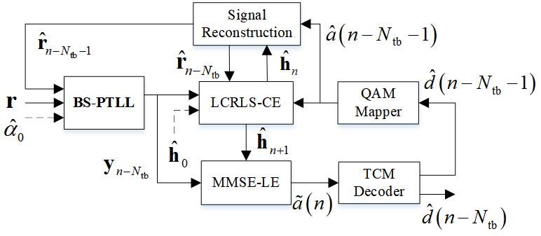 在以往的研究中,针对高阶调制信号多采用嵌入锁相环(Phase-Locked Loop,PLL)的判决反馈均衡器(Decision Feedback Equalizer, DFE)作为接收方案,但是PLL存在相位偏移估计性能随信号星座图案增大而降低的问题,在快速移动下仅利用PLL无法补偿严重的定时偏差,并且随着调制阶数的增加,DFE判决导引可靠性将降低。
