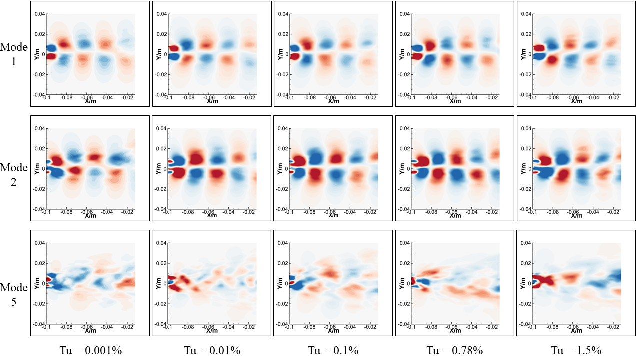 图2 不同湍流度下流向速度的第1、2、5阶POD模态云图(图/yx06永兴彩票集团)