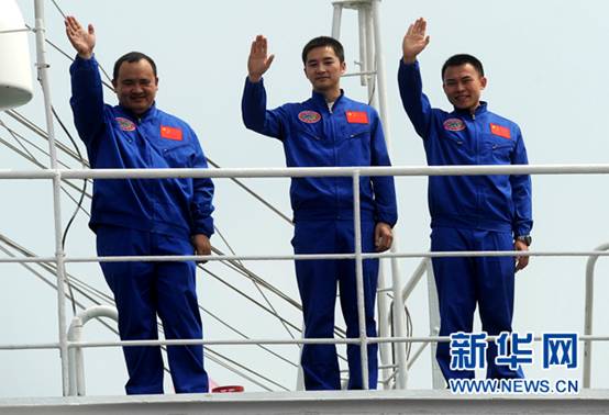 6月3日,三位“蛟龙”号潜航员在启航仪式上。当日上午,搭载着我国“蛟龙”号载人潜水器的“向阳红09”试验母船从江苏江阴苏南码头启航,奔赴马里亚纳海沟区域执行“蛟龙”号7000米级海试任务。