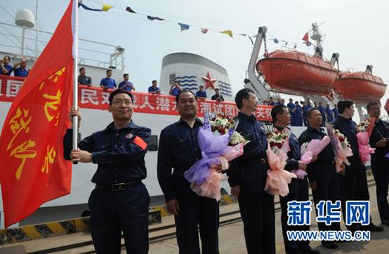 6月3日,三名潜航员在起航仪式上整装待发。当日上午,搭载着我国“蛟龙”号载人潜水器的“向阳红09”试验母船从江苏江阴苏南码头启航,奔赴马里亚纳海沟区域执行“蛟龙”号7000米级海试任务。