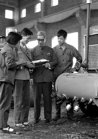 1978年,马大猷(右二)和研究人员在北京第一通用机械厂了解扩散消声器情况。新华社发