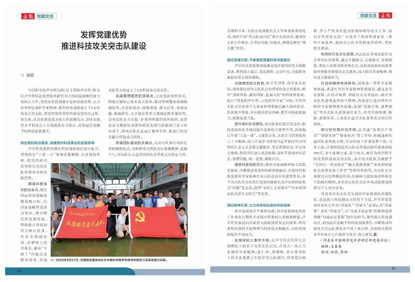 树立好引领示范作用。在评选“优秀共产党员”“创新先锋”“敬业标兵”等工作中,积极选树先进团队及典型人物,号召科技工作者鼓舞干劲、力争上游。汪德昭深蓝突击队在外场试验中连续奋战398天,舍小家顾大家,奋力攻关,被评为中国科学院优秀科技攻关突击队。多名突击队队员被授予“全国五一劳动奖章”“载人深潜英雄”“中央和国家机关优秀党务工作者”等荣誉和称号。突击队充分发挥党员先锋模范作用,以榜样力量加强对科研骨干的政治吸纳,多名突击队队员在外场试验现场郑重写下入党申请书。