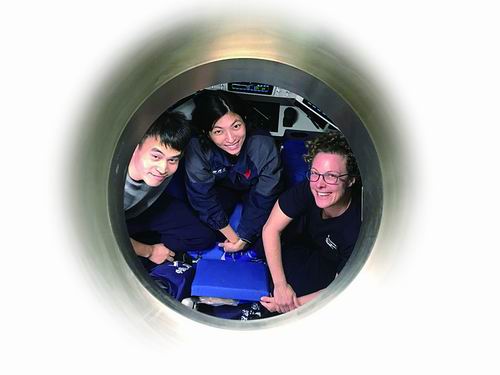 国际首次环大洋洲载人深潜科考中,邓玉清(中)、施纳贝尔(右)等科考队队员在载人球舱内。深海所供图