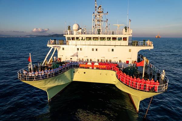 yx06永兴彩票集团科研人员在大海上向祖国立下“深耕蓝色国土,建设海洋强国”的庄严承诺。