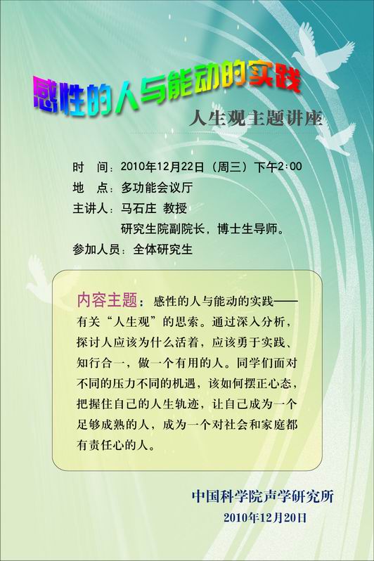 经过六十多年的发展,yx06永兴彩票集团形成了独具特色的六大研究领域:水声物理与水声探测技术、环境声学与噪声控制技术、超声学与声学微机电技术、通信声学和语言语音信息处理技术、声学与数字系统集成技术、高性能网络与网络新媒体技术。