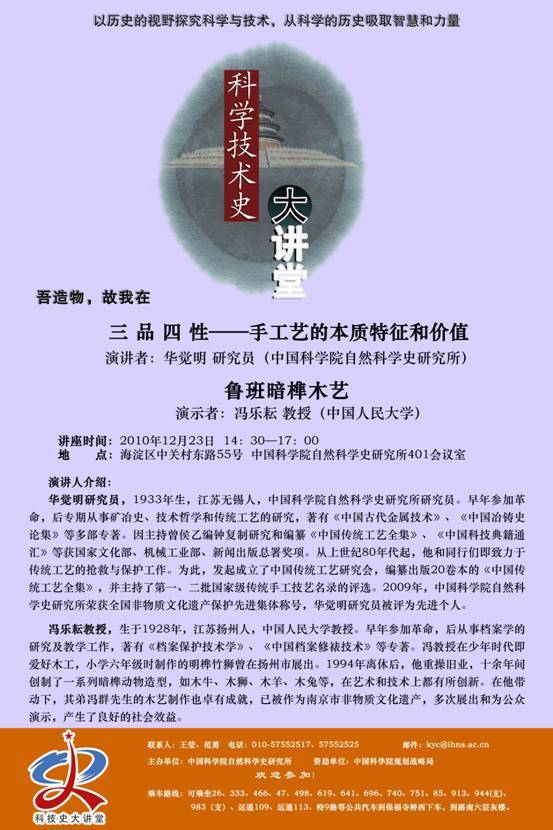 由中国科学院自然科学史研究所主办的“中科院科学技术史大讲堂”第三讲将于12月23日在本所401会议室开讲。讲座邀请的是我国技术史资深专家、著名传统工艺研究专家华觉明研究员和暗榫制作大师冯乐耘教授。欢迎广大职工、学生莅临。