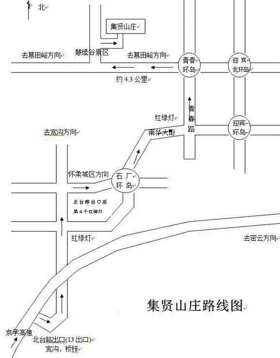 集贤山庄路线图如图2所示。从机场出发,可由机场高速经六环或五环进入京承高速,从13号出口(宽沟方向)离开,再沿图2路线行驶,抵达集贤山庄,全程约60公里。从北京站或北京西站出发,可经二环、机场高速至京承高速,从13号出口(宽沟方向)离开,再沿图2路线行驶,全程约70公里。