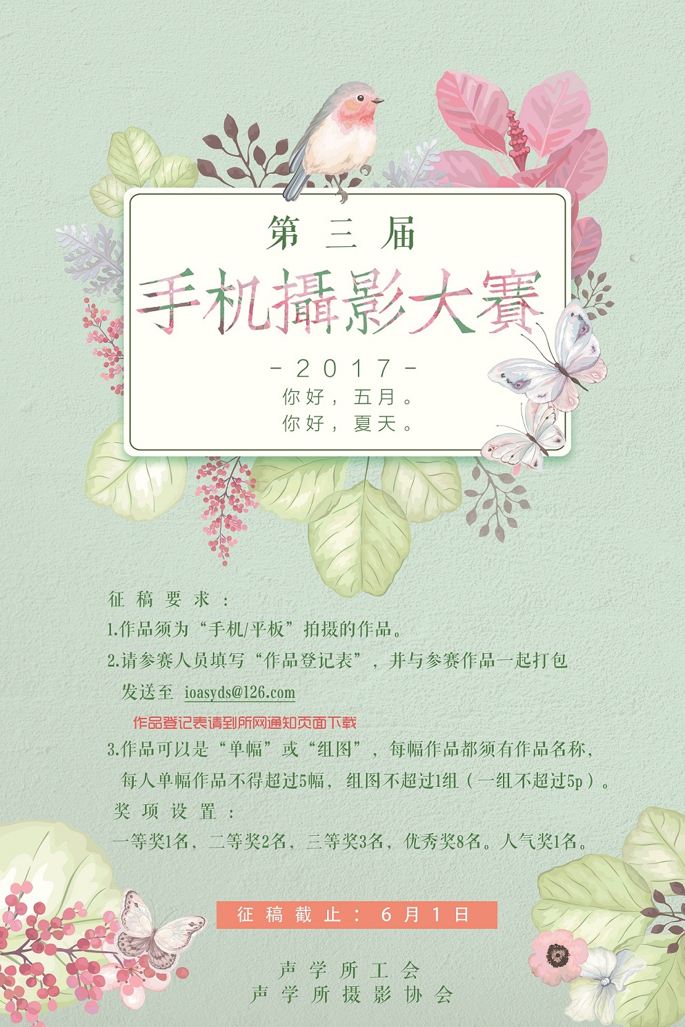 请将作品电子版及填写好的摄影作品登记表(附件2)打包,以“实验室+姓名”命名文件夹打包发送至ioasyds@126.com。