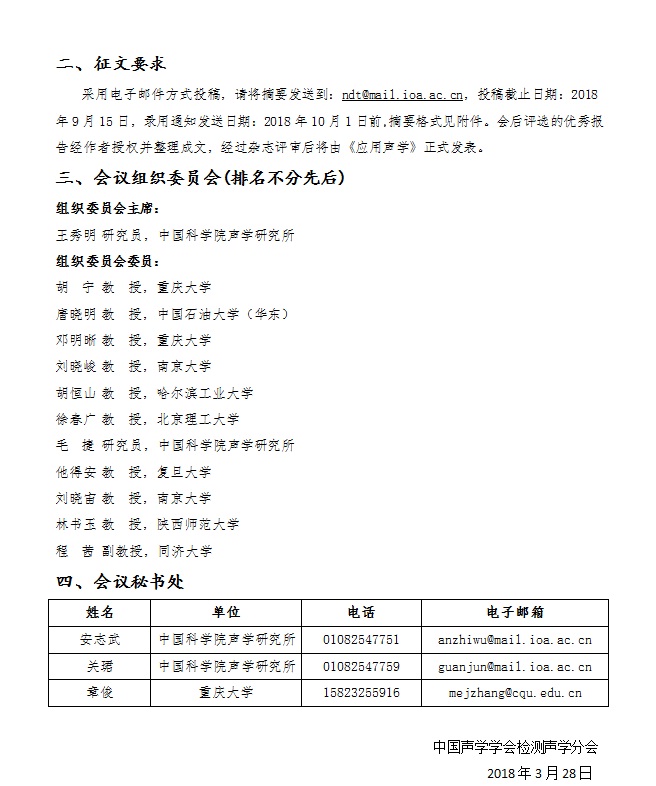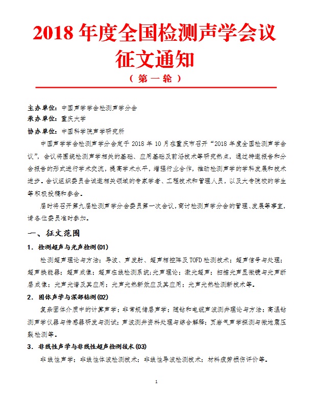 2018年度检测声学会议征文通知(第一轮)