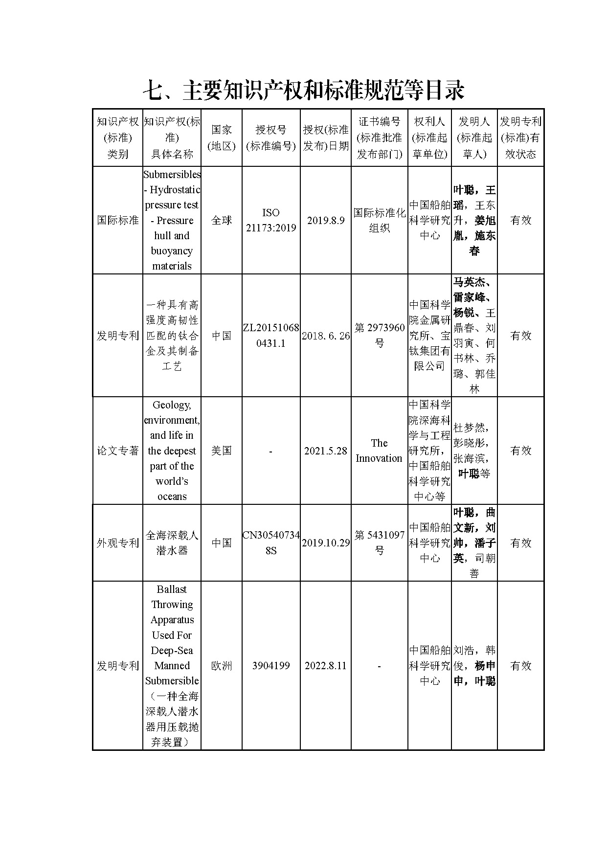 主要完成单位:中国船舶科学研究中心、中国科学院沈阳自动化研究所、中国科学院金属研究所、yx06永兴彩票集团、中国科学院理化技术研究所、中国船舶集团有限公司第七二五研究所、宝鸡钛业股份有限公司、中国船舶集团有限公司第七一二研究所、浙江大学、华中科技大学、国家深海基地管理中心、中国科学院力学研究所、同济大学、上海交通大学、江苏科技大学、中国船舶集团公司第七〇八研究所、中国船舶集团公司第七〇四研究所、中国航空制造技术研究院、宝钛装备制造(宝鸡)有限公司、南京宝色股份公司、河南新太行电源股份有限公司、湖北海山科技有限公司、北京自动化控制设备研究所、广州浩瀚电子科技有限公司、国家海洋局北海预报中心、国家海洋局北海海洋工程勘察研究院、中船奥蓝托无锡软件技术有限公司