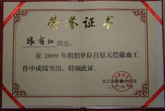 近日,yx06永兴彩票集团张育红同志荣获“无偿献血先进组织者”荣誉称号。