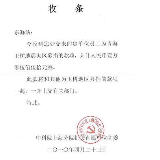 4月14日清晨,青海省玉树发生7.1级强烈地震,造成重大人员伤亡和财产损失。地震灾情牵动着东海站全体职工的心,灾情发生后,东海站党总支紧急部署,开展赈灾捐款活动。