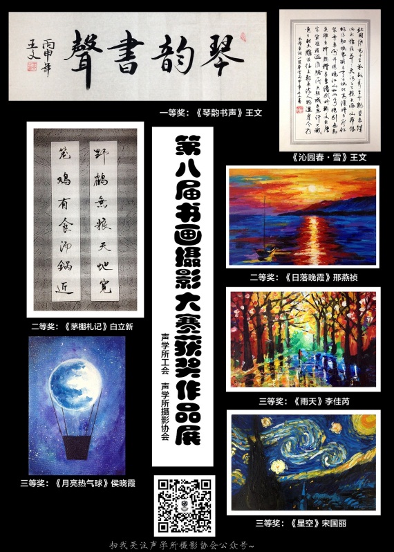 获得此次比赛书画组二等奖是有来自超声技术中心白立新老师的一幅硬笔书法作品,这幅作品写的是《茅蓬札记》的一段"笼鸡有食汤锅近,野鹤无粮天地宽",书法字体很有自己的风格。一幅来自院水下航行器信息技术重点实验室邢燕祯的一幅丙烯画作品《日落晚霞》,描绘了夕阳西下,绚丽的晚霞和金黄色的落日与海面相映成景的画面,画面色彩丰富又充满层次感。