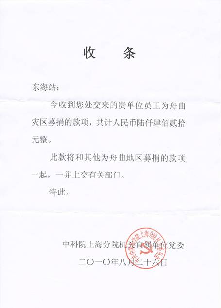 2010年8月7日深夜至8月8日凌晨,甘肃藏族自治州舟曲县突发特大山洪泥石流造成重大人员伤亡和财产损失,为帮助灾区人民渡过难关,重建家园,东海站党总支根据中科院沪区党委的指示精神,组织全站职工行动起来,伸出援助之手,积极捐款,奉献爱心。截止8月25日,全站职工共有63人参加捐款,共收到捐款人民币陆仟肆佰贰拾元整。8月26日,捐款已送至中科院沪区党委。