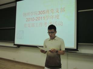 在会议开始,首先进行的是支部活动的评议。开始先由支部书记带领大家一起学习了《关于开展2010—2011学年度党支部工作考评活动的通知》,然后介绍了本次活动的重要意义及其重要性,对与会党员在本次活动的表现和做法提出了要求。之后由支部书记为班级党支部成员作了一学年来的班级党支部工作报告,分别从支部建设、党建活动、发展党员等常规工作三个方面作了回顾,介绍了一年来班级党支部开展的一系列工作,与会党员听得认真,记得仔细。