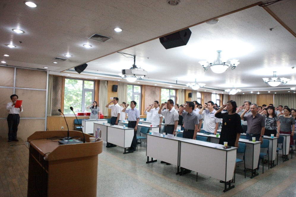 面对鲜红的党旗,党委委员李双田带领全体党员重温入党誓词。“为共产主义奋斗终身,随时为党和人民牺牲一切,永不叛党。”铿锵有力的誓言在会场上激荡,全体党员又一次受到了精神洗礼。