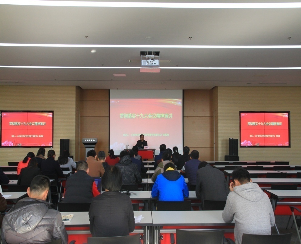 11月24日上午,山东省花生研究所党委专职副书记陈殿绪到北海站做了十九大精神的宣讲报告,会议由北海站党委书记安俊英主持,北海站全体员工共50余人参加此次活动。