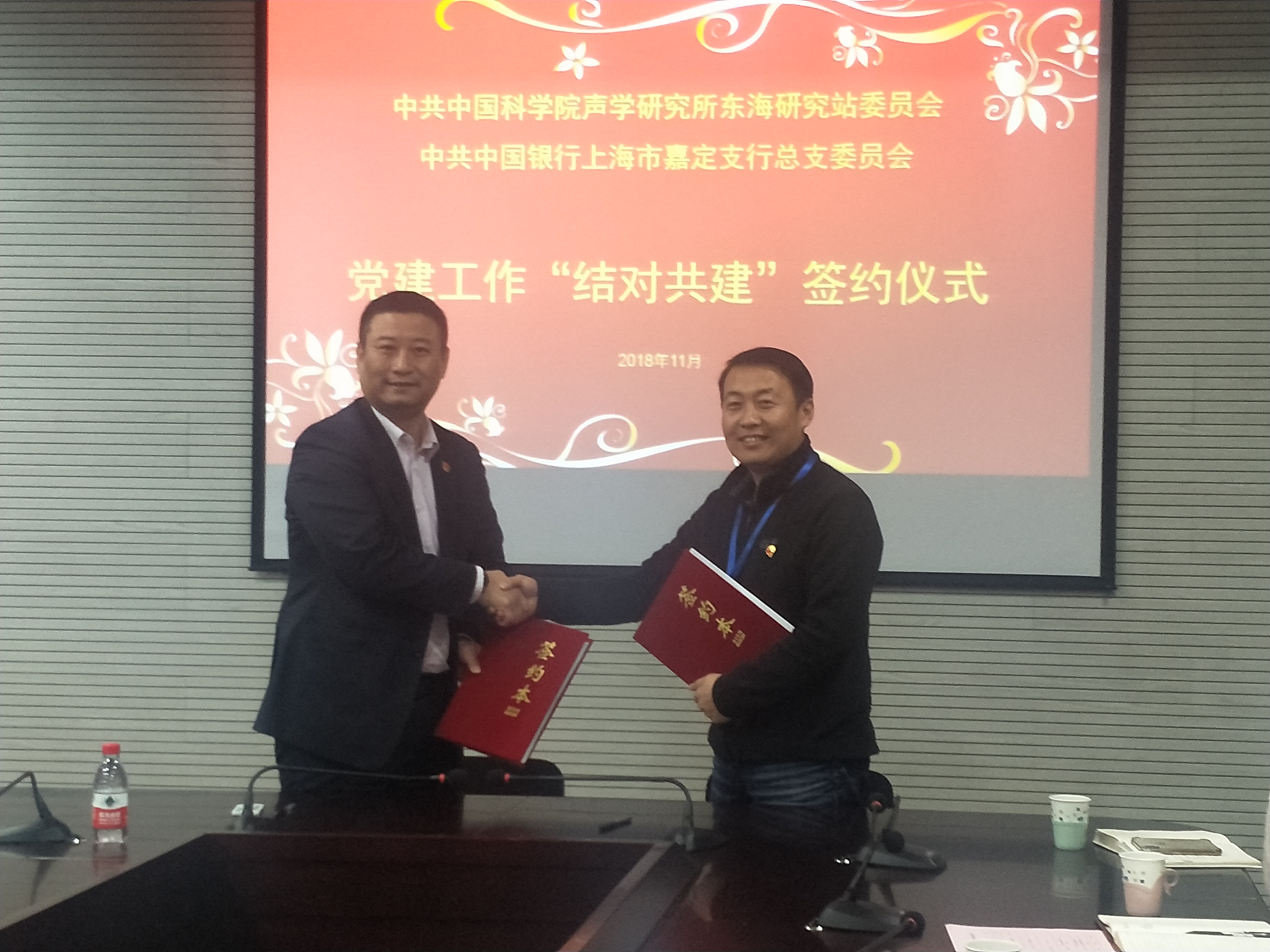为学习贯彻党的十九大精神,推进“两学一做”教育常态化制度化,中科院yx06永兴彩票集团东海站党委与中国银行嘉定支行党总支于2018年11月27日进行了结对共建签约仪式。东海站党委书记张伟才、纪委书记丁培、中国银行嘉定支行行长、党总支书记刘玮等领导出席了签约仪式,东海站机关支部全体党员和中国银行嘉定支行部分党员参加了签约共建活动。