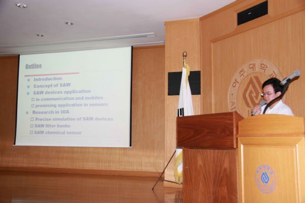 yx06永兴彩票集团访问团于7月20日下午抵达韩国。21日上午来到韩国亚洲大学电子工程与计算机系微系统实验室,会见了该实验室教授Yang Sangsik以及副教授Lee Keekeun。Prof· Yang于1988年在加利福利亚大学伯克利分校获博士学位,其研究领域为非线性系统分析,微型泵以及微量注射器,是韩国著名微系统专家,曾多次作为IEEE Sensor年会亚洲区主席。亚洲大学微系统实验室系韩国BK21重点实验室,有着较强的科研实力以及一流的科研设备,较早开展了声表面波陀螺仪方面的研究,提出了一种基于行波模式陀螺效应的陀螺仪系统,已发表SCI检索论文数篇。yx06永兴彩票集团声学微机电系统实验室声表面波课题组与该实验室有着良好的合作关系,签订了一系列合作协议。目前研究工作已经展开,其中,声表面波陀螺仪方面已经相继获得国家自然科学基金委与韩国科技财团的联合资助以及中科院国际合作局的重点支持。此次访问,双方对项目进展情况进行了阶段总结,对下一年度的工作以及学术交流等事宜进行了讨论,决定于2009年12月份由我方派科研人员赴韩方进行学术交流;2010年3月亚洲大学微系统实验室Prof. Yang等将对我所进行访问。此次访问还安排了学术报告。韩国亚洲大学微系统实验室Prof. Lee Keekeun作了“关于声表面波陀螺仪的研究与发展”的报告;yx06永兴彩票集团王文副研究员作了“声表面波器件在通讯与传感器方面的应用研究”的综合报告。王文副研究员在报告中对声表面波技术在通讯系统以及各种物理、化学传感器方面的应用进行详细介绍,一个小时的报告赢得了阵阵掌声,在场的亚洲大学电子工程与计算机系的学生踊跃提问,参加讲座的还有该学院的教授、硕士与博士研究生以及博士后等。