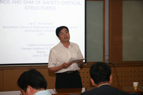 王所长主持了学术报告会,并对Achenbach教授作了热情洋溢的介绍。Achenbach教授1959年毕业于荷兰Delft理工大学,1962年于美国Stanford大学获得博士学位,并于1963年入职西北大学,是西北大学质量工程和破坏预防中心的创始人。该中心致力于结构力学的质量控制,在航空等工业领域有着深远的影响。Achenbach教授发展了材料缺陷的超声散射探测与表征方法。通过分析和实验,对地震机理、复合材料动载力学响应、火箭推进器振动等问题上得到了出色的结果。王所长特别指出Achenbach教授长期以来一直热心关注和中国学者之间的学术交流,希望年轻的科研工作者能够继续保持这种态势。