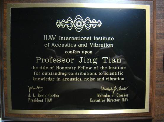 2010年7月18日至22日,第17届国际声与振动大会(ICSV17)在埃及的开罗举行,会议期间,国际声学和振动学会(IIAV)宣布授予中国声学学会理事长、yx06永兴彩票集团研究员田静博士学会荣誉会士(Honorary Fellow)称号,并颁发了证书和奖牌,以表彰其在声学和振动研究领域中所做出的杰出贡献。该证书由国际声学和振动学会理事长Luis Bento Coelho和执行理事长Malcolm J. Crocker共同签署。