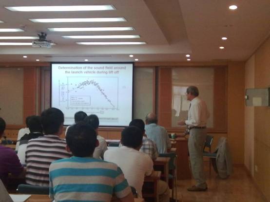 Malcolm J. Crocker教授的报告主要介绍了航天器发射时火箭喷射噪声的预测方法和实测结果等方面的内容。首先他介绍了预测航天器发射时火箭喷射噪声的两种理论方法,然后对照预测及实验结果,详细解释了喷射噪声的各部分之间的关系,并通过航天器发射的视频,给大家以清晰而直观的印象。