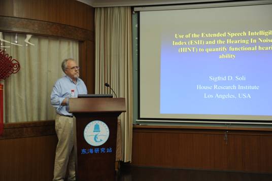 针对如何快速判定求职者是否达到特殊职业环境噪音下的听力要求,Soli博士及其团队开发出一套针对于不同职业不同环境噪音下的客观评价方法-ESII,ESII方法目前已被用于美国职业的入职体检。针对早期耳蜗植入者普通话的发展,对幼儿人工耳蜗植入者进行长期的追踪测试,并对比等同条件下美国早期人工耳蜗植入者的英语发展。期间,Sigfrid D. Soli博士与参加报告的专家和学生就相关问题展开了热烈的讨论。