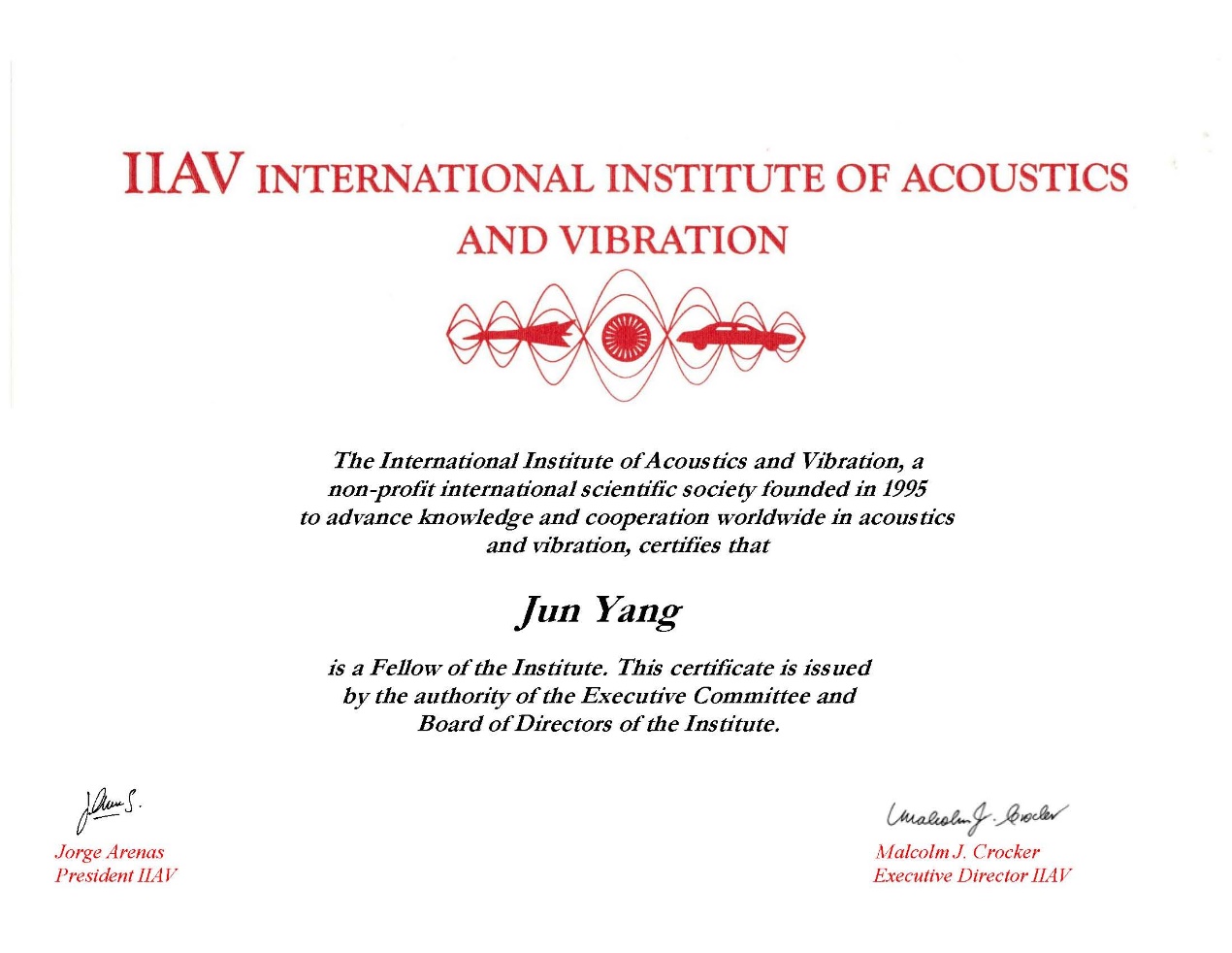 2016年10月7日,中国科学院噪声与振动重点实验室杨军研究员收到国际声学与振动学会(International Institute of Acoustics and Vibration, IIAV)理事长Jorge Arenas,IIAV成员委员会主席Rupert Thornely-Taylor和执行理事长Malcolm J. Crocker的共同来函和证书,祝贺其当选IIAV会士(Fellow)以表彰杨军研究员在声学研究与教育领域的杰出贡献(contributed significantly to acoustics research and education)。相关当选信息已于2016年6月在国际声学与振动期刊(the International Journal of Acoustics and Vibration, IJAV) 第21卷第2期发布。