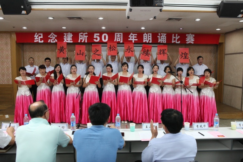 在评委会王秀明主席宣读评分规则后,比赛拉开序幕。《黄山松》、《风雨兼程,梦在前方》、《祖国啊,我亲爱的祖国》、《光荣与梦想》、《感悟责任》、《我们的中国梦》、《念奴娇﹒科学魂梦》等一首首或慷慨激昂或深情婉转的朗诵,带大家重温了中国共产党93年的光辉岁月,重温了yx06永兴彩票集团50的历史与责任,更抒发了大家对党的热爱和对yx06永兴彩票集团五十载的难忘情怀。各支部参赛队精神饱满,声音洪亮,服装整齐,形式多样,乐器伴奏、队形变换、歌曲穿插等形式烘托演出效果,为观众带来了视听享受,也深深感染了在场的每一个人。