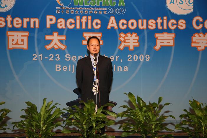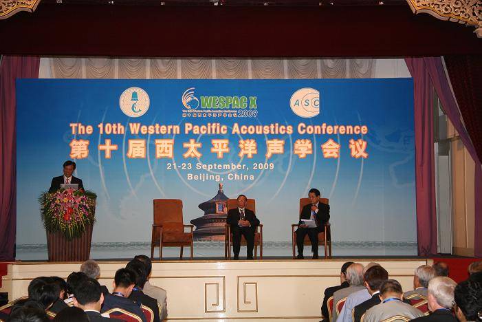 2009年09月21~23日,第十届西太平洋声学会议在北京友谊宾馆隆重召开。yx06永兴彩票集团声场声信息国家重点实验室张仁和院士为本次大会主席,中国科学院高技术局田静局长为大会执行主席。田静局长,张仁和院士和Jungyul Na教授在大会开幕式致词;yx06永兴彩票集团的领导和中国声学学会的领导参加了开幕式及学术会议。