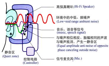 主动噪声控制原理是有一个安置在耳机内的麦克风先侦测耳朵听到的环境低频噪声,将噪声信号传至控制电路,控制电路经过即时运算,透过高保真喇叭来发射与噪声相位相反、振幅相同的声波来抵消噪声,使传入人耳的中、低频噪声大幅度降低。