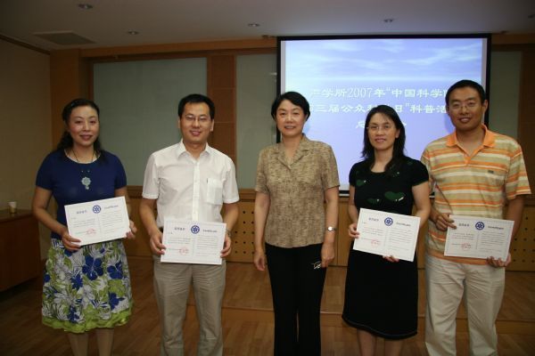 总结会上,居琦副所长和科技处处长库卫群、办公室副主任发强、团委书记张云鹏、学生会主席陈佳路向参加公众科学日活动的职工和学生分别颁发了科普工作者和科普志愿者荣誉证书,并与大家合影留念。