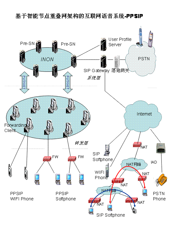 研发支持IPv6的P2P SIP的核心网关设备,并利用该网关设备在P2P弹性重叠网上搭建可运营可管理的VoIP业务平台,支持IAD、SIP Phone、移动WiFi Phone、Soft Phone等多种终端的接入,具有PC2Phone、Internet Voice、Conference、Instant Message、Presence等增值功能;充分利用自动组网和DHT技术提高该平台的易操作性、可扩展性和健壮性,降低该平台的运维成本;并通过网络测量、路由优化、数据转发等技术保障视音频服务的QoS;通过对标准SoftSwitch和TG等设备的支持,实现与传统电信网络或其他SIP系统的互通。