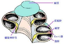 耳蜗是人内耳的一部分,形似蜗牛壳,是一个中空的螺旋形骨管,全长约30~32毫米,其内部充满液体。耳蜗螺旋管内共有3个管腔,分别是前庭阶、中阶和鼓阶,中阶又叫蜗管。前庭阶和中阶由前庭膜分隔,中阶和鼓阶由基底膜分开。前庭阶和鼓阶内充满外淋巴液,中阶内充满内淋巴液,前庭阶和鼓阶内的外淋巴液经蜗顶的蜗孔相通。位于蜗管基底膜上的螺旋器(Corti 器)由毛细胞、支柱细胞和盖膜构成,是听觉感受器。