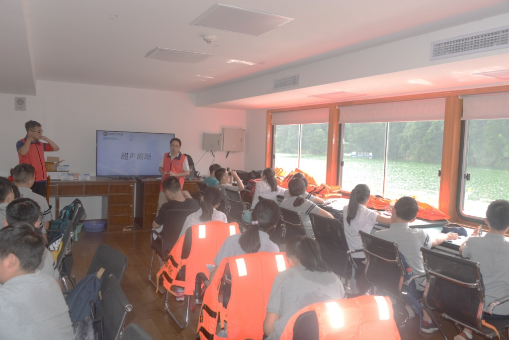 科普老师对声学科普长廊、海陆空一体化模型的讲解,让同学们对声学基础知识有了初步的认识;在超声清洗、超声雾化、超声乳化、超声悬浮、超指向性喇叭、鱼探仪等多项声学趣味互动实验中,同学们通过观察一个个神奇的声学现象,深入探究了其背后蕴藏的声学原理;科普老师对耳朵模型的讲解,结合耳道观察、听力测试、声源定位等实验,让同学们对人耳的结构及功能、听觉的形成、双耳声源定位的原理等有了比较深刻的理解;在超声测距微科研课程中,科普老师从声学理论、工程实现、科学实验等角度,为同学们浓缩展现了科学研究的过程,同学们亲自动手完成了形式多样的测距实验。