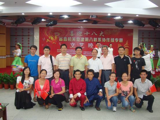 为迎接党的十八大胜利召开,海南省直机关党建第八联系协作组“喜迎十八大”专题文艺晚会,8月14日下午在海南日报社演播大厅隆重举行。此次专题演出由南海研究站和海南省直机关党建第八协作组成员单位:中改院、海南日报社、海南电视台、中国热带农业科学院、省农业科学院、省规划设计院、新华通讯社海南分社、海南储备物资管理处、海南博鳌控股有限公司10个单位共同承办。