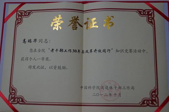 2012年7月,院离退休干部工作局面向全院离退休干部工作人员开展了“老干部工作30年与改革开放同行”知识竞赛活动。此次活动以纪念干部离退休制度建立30周年为契机,力求全面提升离退休干部工作人员的政策水平。我所高瑞华同志参加并荣获个人一等奖。
